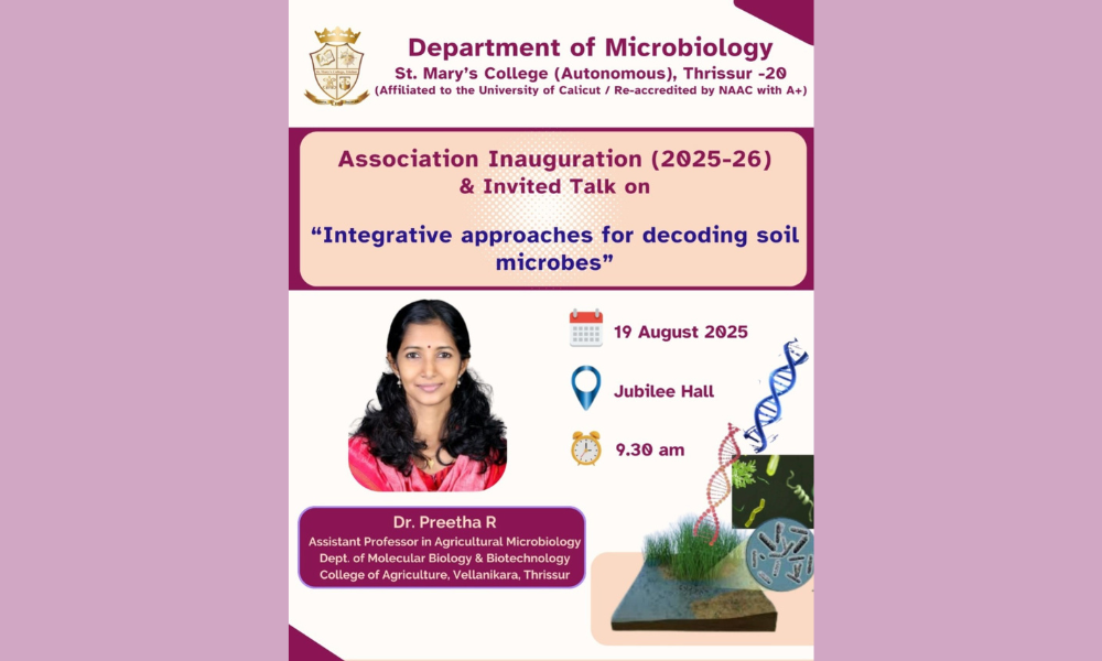 The Department of Microbiology, St. Mary’s College (Autonomous), Thrissur, is organizing the Association Inauguration (2025-26) followed by an invited talk on “Integrative Approaches for Decoding Soil Microbes.” The session will be led by Dr. Preetha R, Assistant Professor in Agricultural Microbiology, Department of Molecular Biology & Biotechnology, College of Agriculture, Vellanikkara, Thrissur. The program will be held on 19th August 2025 at 9:30 am in Jubilee Hall.