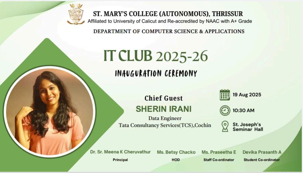 The Department of Computer Science & Applications, St. Mary’s College (Autonomous), Thrissur, is organizing the Inauguration Ceremony of the IT Club for the academic year 2025-26. The event will be graced by Ms. Sherin Irani, Data Engineer at Tata Consultancy Services (TCS), Cochin, as the Chief Guest. The ceremony is scheduled for 19th August 2025 at 10:30 AM in St. Joseph’s Seminar Hall.