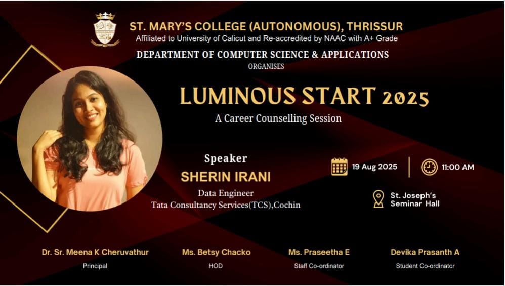 The Department of Computer Science & Applications, St. Mary’s College (Autonomous), Thrissur, is hosting “Luminous Start 2025,” a Career Counselling Session designed to guide and inspire students in their professional journey. The session will be led by Ms. Sherin Irani, Data Engineer at Tata Consultancy Services (TCS), Cochin. The event will take place on 19th August 2025 at 11:00 AM in St. Joseph’s Seminar Hall.