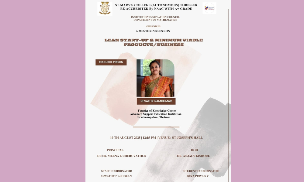 The Institution Innovation Council and the Department of Mathematics, St. Mary’s College (Autonomous), Thrissur, organized a mentoring session on the theme Lean Start-up & Minimum Viable Products/Business on 19th August 2025 at St. Joseph’s Hall. The resource person for the session was Revathy Ramkumar, Founder of Knowledge Center, Advanced Support Education Institution, Eravimangalam, Thrissur. The programme aimed to provide students with valuable insights into entrepreneurship, innovation, and strategies for developing minimum viable products. The event was held under the guidance of Dr. Sr. Meena K. Cheruvathur (Principal), with Dr. Anjaly Kishore (HoD), Aswathy P. Ashokan (Staff Coordinator), and Deva Priya S. V. (Student Coordinator) ensuring its smooth conduct.