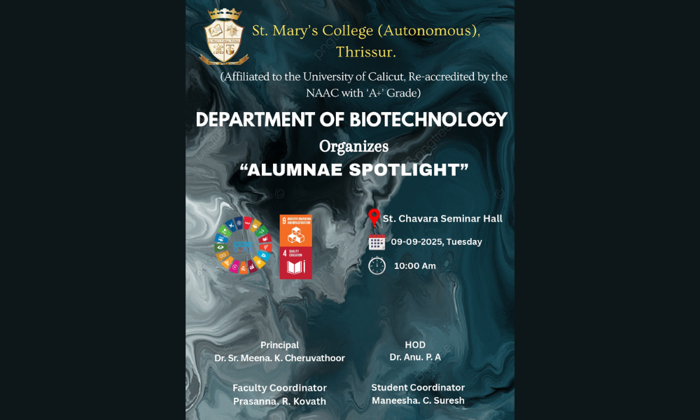 The Department of Biotechnology, St. Mary’s College (Autonomous), Thrissur, is delighted to organize “Alumnae Spotlight” on 9th September 2025 (Tuesday) at 10:00 AM in the St. Chavara Seminar Hall. This event is designed to celebrate the achievements of our esteemed alumnae, providing students with inspiring insights into their professional journeys and experiences.