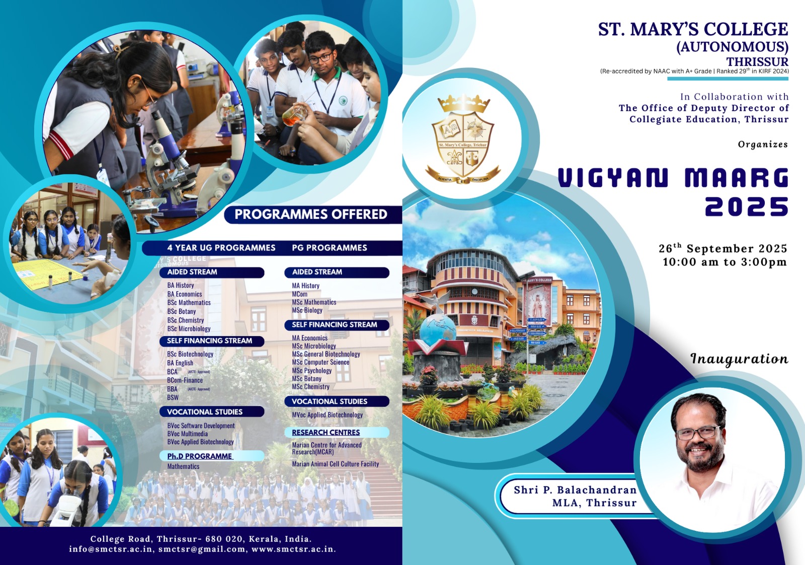St. Mary’s College (Autonomous), Thrissur, in collaboration with the Office of the Deputy Director of Collegiate Education, Thrissur, will organize Vigyan Maarg 2025 on 26th September 2025, from 10:00 am to 3:00 pm.