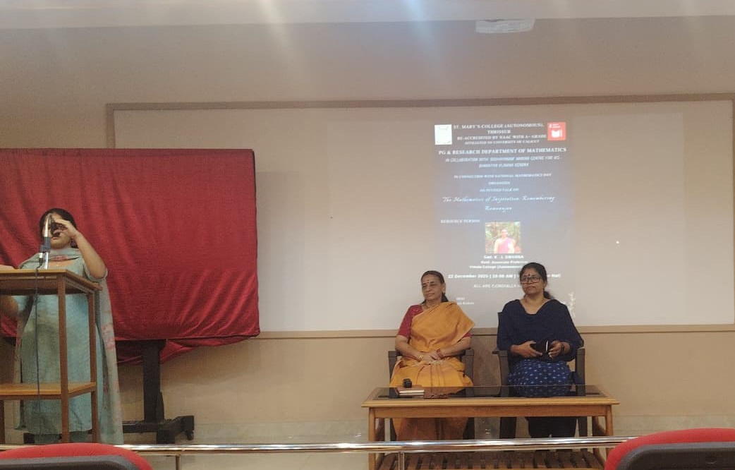 In connection with National Mathematics Day, the PG & Research Department of Mathematics, St. Mary’s College (Autonomous), Thrissur, organized an invited talk titled “The Mathematics of Inspiration: Remembering Ramanujan” on 22 December 2025 at Jubilee Hall.